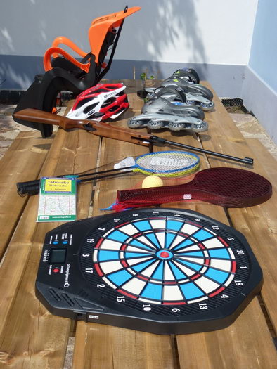 Půjčujeme zejména kvalitní treková a horská kola s plným vybavením včetně brašen a přileb. Máme i speciální vybavení pro děti - dětská kola, vozík za kolo Croozer s odpružením (lze využít i pro jogging či jako kočárek), sedačku na kolo, kolečkové In-Line brusle, koloběžku či elektrokolo. Pro milovníky koupání můžeme nabídnout nafukovací čluny, bazénky a další vybavení k vodě. Nechybí ani vybavení na hřiště pro míčové a raketové hry aj. Pro výletníky máme stany, spacáky, mapy a řadu dalších sportovních potřeb, ze kterých si určitě vyberete.