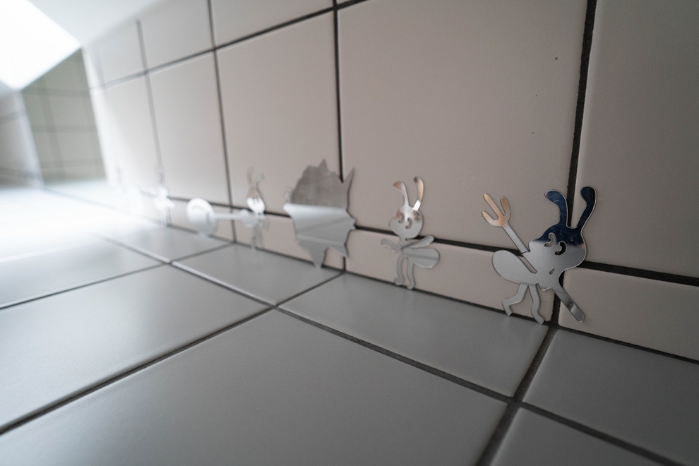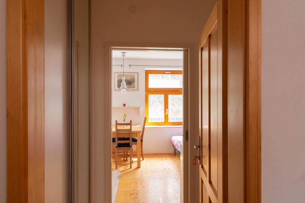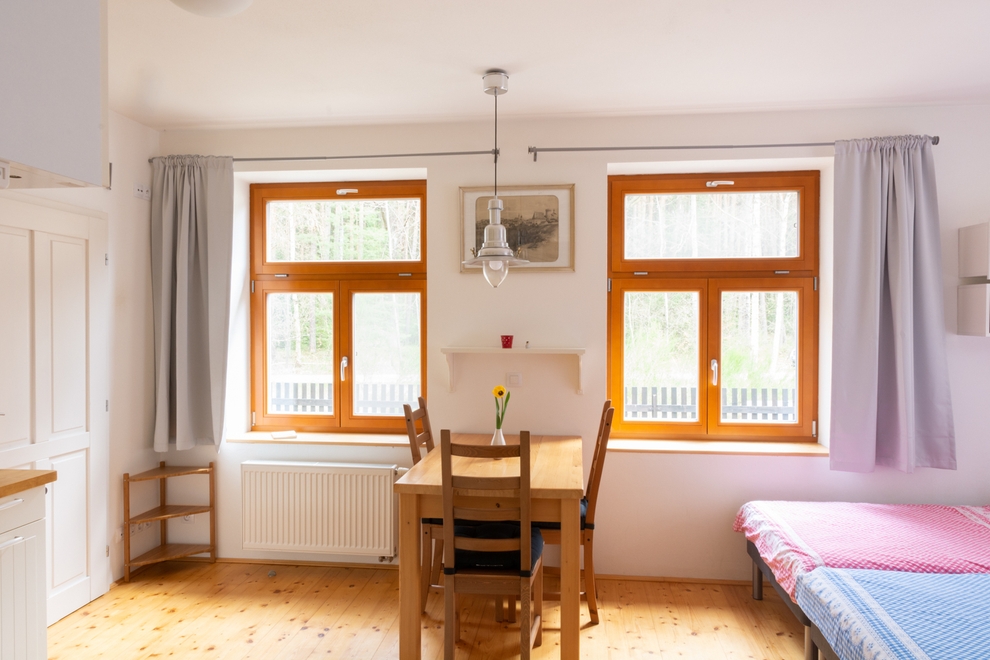 Uprostřed pokoje je jídelní stůl z masivního smrku se židlemi. Okna jsou vybavena roletami, která brání dopadu silných slunečních paprsků v parném létě, a lze je zcela zatemnit. Okno je v letním období osazeno sítí proti hmyzu, takže je možné větrat kdykoliv bez obav z komárů.
