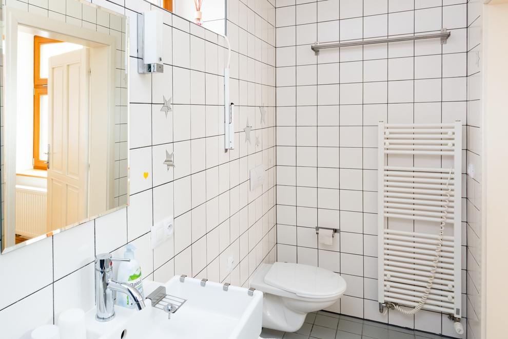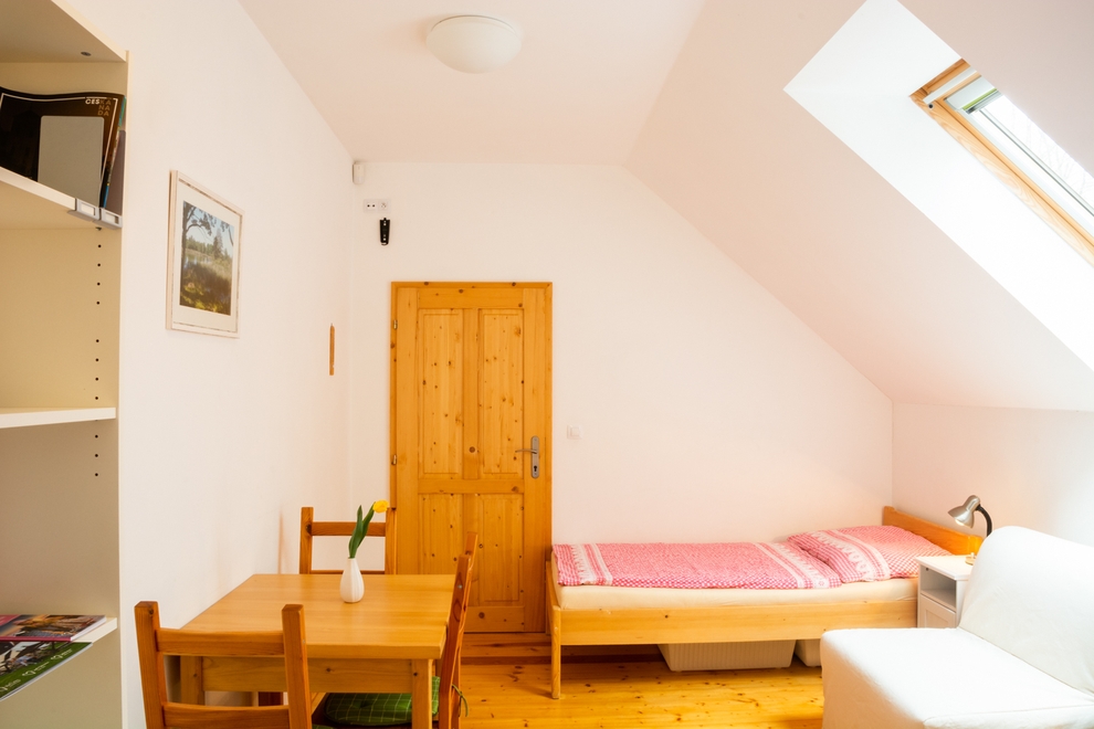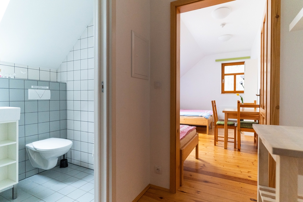 Z předsíně, ve které je vestavná skříň, je vstup také do koupelny o velikosti 3,3 m2. Koupelna je vybavena sprchovým koutem se sedací lavicí, umyvadlem a WC. Koupelna má střešní okno a je zde i možnost nuceného odvětrávání ventilátorem. Topný žebřík v koupelně je opatřen i elektrickou patronou, takže je možné si přitopit i mimo topnou sezónu. V přepočtu na lůžka se jedná o nejlevnější pokoj v penzioně.