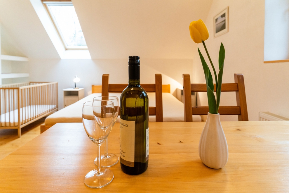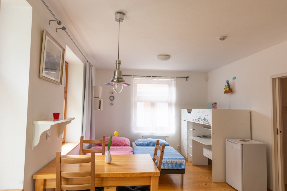 V pokoji je jídelní stůl z masivu se židlemi. U postelí nechybí stolky s lampičkami. Okno je v letním období osazeno sítí proti hmyzu, takže je možné větrat kdykoliv bez obav z komárů. V zimním období si lze v pokoji nastavit příjemnou teplotu pomocí termostatických ventilů na radiátorech, protože každému vyhovuje jiná teplota. Lze si také přitopit elektrickým olejovým radiátorem. Do pokoje lze umístit přistýlku. Součástí pokoje jsou přípojky na TV, SAT či internet. Na přání hosta můžeme na pokoj zapůjčit minikuchyňku s varnou konvicí, aby si hosté mohli uvařit čaj a podobně.