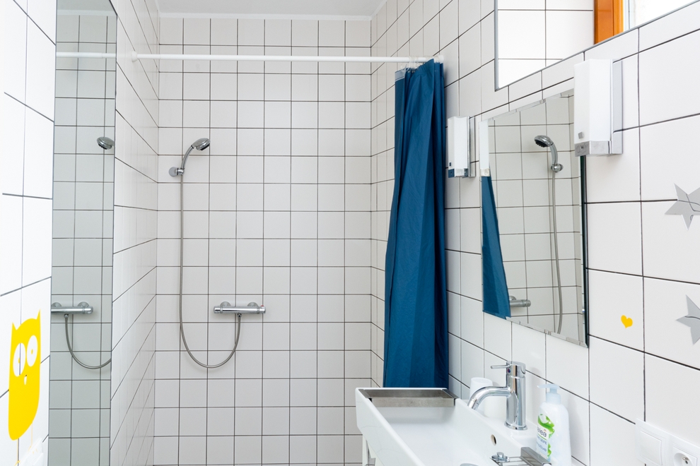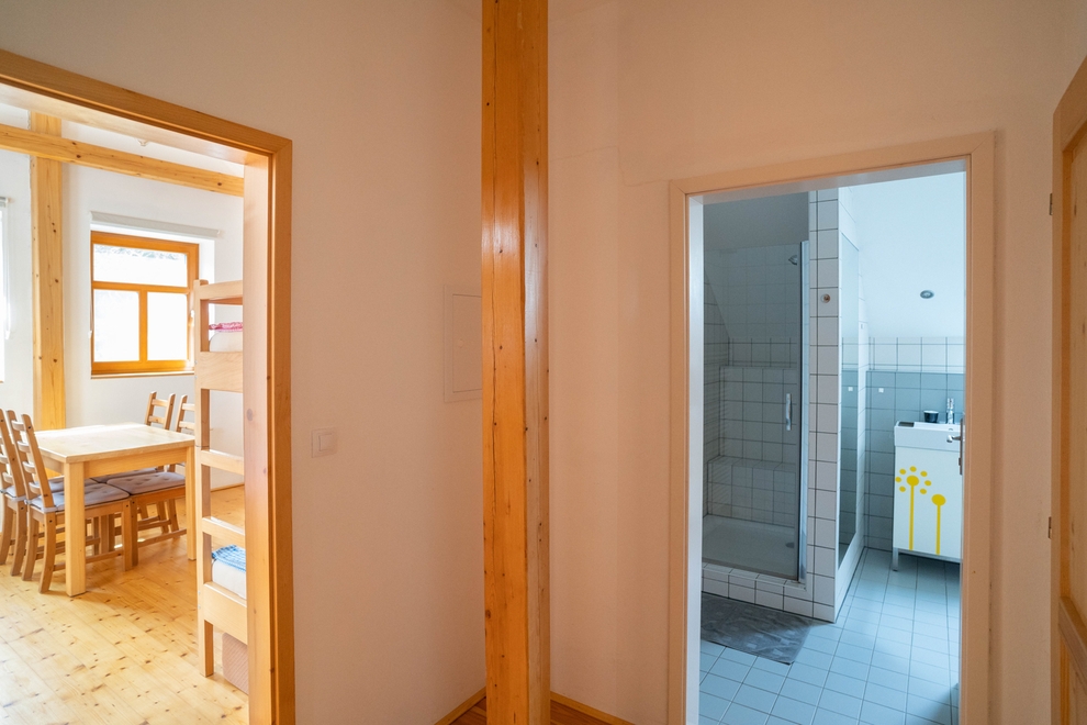 Z předsíně, ve které je velká vestavná skříň, je vstup také do koupelny, opět luxusních rozměrů (7,5 m2). Koupelna je vybavena sprchovým koutem se sedací lavicí, umyvadlem a WC. Koupelna má střešní okno a je zde i možnost nuceného odvětrávání ventilátorem. Nejen rodiče s dětmi ocení u sprchy termostatickou baterii, která zajistí každému příjemnou teplotu vody a pojistka zabrání opaření. Do koupelny lze (na přání hosta) umožnit vstup i přímo z chodby, což lze využít u větších skupin, kdy část hostů stanuje na zahradě. Dlažba podlahy je přirozeně vyhřívána díky umístění koupelny nad kotelnou.