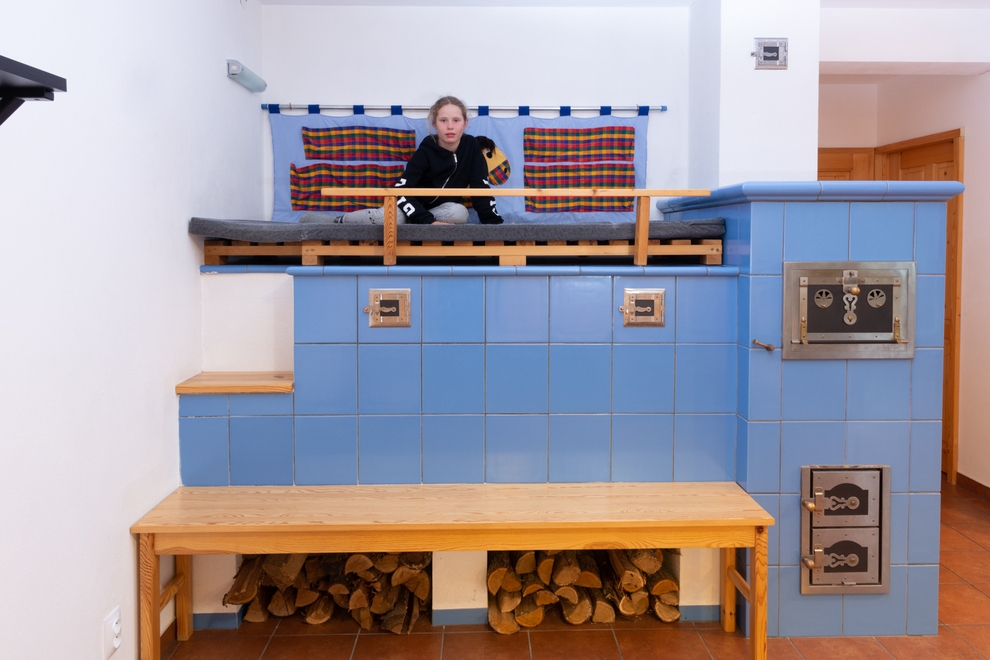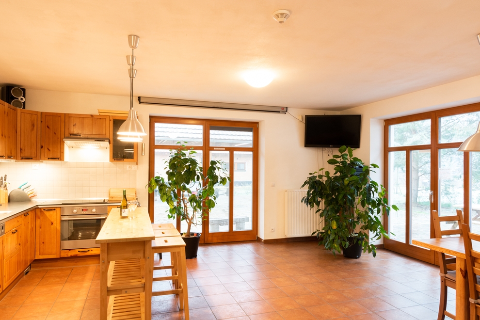 V přízemí penzionu v západní části budovy je hostům k dispozici prostorná společenská místnost s kuchyňským koutem a s klasickou kachlovou pecí s ložnou plochou nejen pro lenochy. Pec je sice z roku 2011, ale je vystavena z klasických kachlů a spojována kamnářským jílem. V babce pece je nerezová trouba, ve které je možné péct. Ložná plocha je pochopitelně vyhřívaná. Po zaškolení mohou klienti v peci sami topit, pokud ovšem nehrozí přehřátí místnosti (např. v letních vedrech). Kuchyňský kout je plně vybaven vším potřebným i pro ty nejnáročnější strávníky a větší skupiny. K dispozici je zde horkovzdušná trouba, mikrovlnná trouba, myčka na nádobí, sklokeramická varná deska, kávovar na espresso a kapučíno, rychlovarná konvice a lze si zapůjčit toustovač či topinkovač. Součástí kuchyňské linky je prostorná lednice s mrazákem. Společenská místnost má dvě francouzská okna, jedno je situováno na jih do dvora, druhé na západ s krásným výhledem na zahradu a hlavně na dětské hřiště, takže rodiče budou mít děti vždy pod kontrolou. Současně lze tímto oknem vstoupit na terasu s dřevěným posezením a s markýzou.
