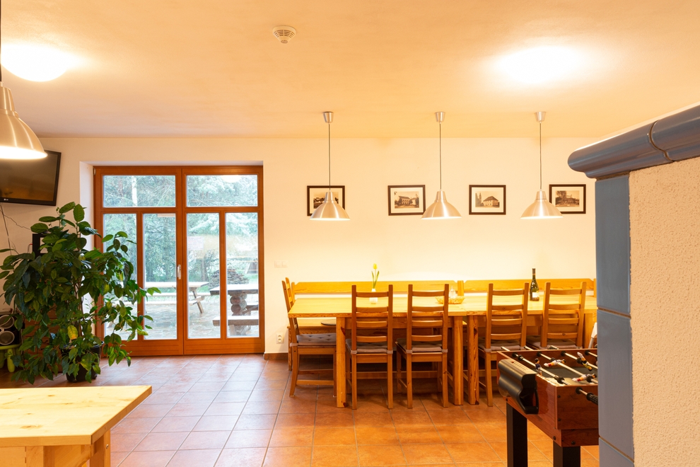 Pochopitelně nechybí ani dva velké masivní smrkové stoly s lavicemi (s úložným prostorem), ke kterým se pohodlně usadí 10 až 12 osob. U kuchyňského koutu je další stůl s barovými židlemi a s výhledem na pípu.